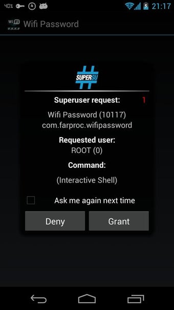 รหัสผ่าน Wifi (ROOT) เป็นเครื่องมือที่มีประโยชน์มากเมื่อต้องกู้คืนรหัสผ่านจากเครือข่าย WiFi แอปพลิเคชั่นนี้มี ส่วนต่อประสานกับผู้ใช้ที่เรียบง่าย โดยรวมซึ่งทำให้สามารถดูรหัสผ่านที่อุปกรณ์มือถือเคยใช้ก่อนหน้านี้ได้อย่างรวดเร็ว ไม่มีคุณสมบัติแฟนซีหรือการตกแต่งใด ๆ ที่รวมเข้าด้วยกันเพื่อส่งมอบงานที่เรียบง่าย สามารถ แสดงรหัสผ่าน WiFi ทุกตัว ที่เคยใช้หรือเก็บไว้ในอุปกรณ์มือถือ ในทางกลับกันผู้ใช้ต้องจำไว้ว่าแอปพลิเคชันนี้ไม่ได้ใช้หรือสามารถแฮ็คหรือตรวจสอบเครือข่าย Wifi ในพื้นที่ได้ ปัจจัยต่อไปที่ผู้ใช้ต้องได้รับการเตือนคืออุปกรณ์มือถือของพวกเขาติดตั้งการเข้าถึงรูทก่อนที่จะใช้แอปพลิเคชัน มิฉะนั้นอุปกรณ์มือถือที่ไม่ได้รูทเครื่องจะไม่สามารถรับรหัสผ่านเครือข่าย WiFi ได้